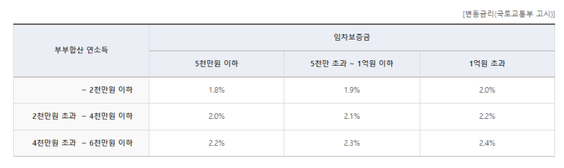 부부합산 연소득이 연 2천만원 이하인 분들은 임차보증금에 따라서 1.8%, 1.9%, 2%의 금리를 받습니다.