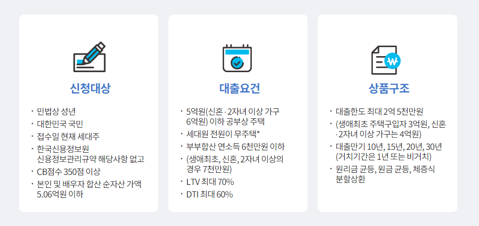 주거 전용면적이 85㎡(수도권을 제외한 도시지역이 아닌 읍 또는 면 지역 100㎡) 이하 주택으로 대출 접수일 현재 담보주택의 평가액이 5억원 이하인 주택(신혼. 2가구 이상 가구 6억원 이하)