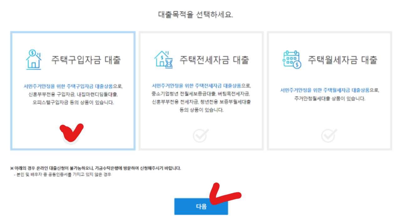 다음은 주택구입자금 대출을 클릭하시고 다음 버튼을 눌러주시면 인적사항 기재 후 대출을 신청하실 수 있게됩니다.