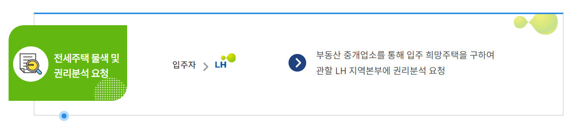 - 부동산 중개업소를 통해 입주 희망주택을 구하여 관할 LH 지역본부에 권리분석 요청