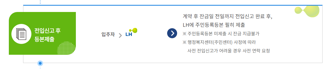 - 계약 후 잔금일 전일까지 전입신고 완료 후, LH에 주민등록등본 필히 제출