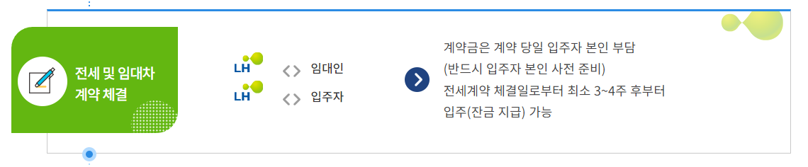 - 계약금은 계약 당일 입주자 본인 부담(반드시 입주자 본인 사전 준비), 전세계약 체결일로부터 최소 3~4주 후부터 입주(잔금 지급) 가능