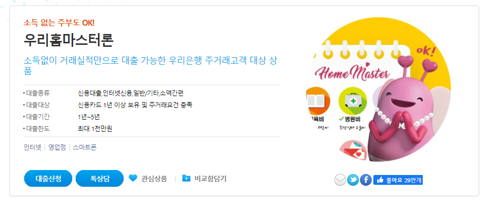 다음은 우리은행의 무직자 대출인 우리 홈마스터론입니다.