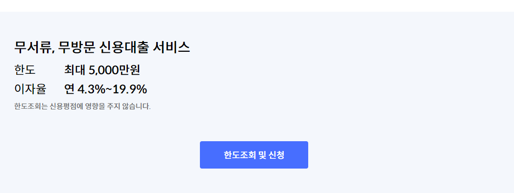마지막으로 소개해드릴 곳은 신한카드의 즉시대출입니다. 신한카드를 이용하는 만 22세 이상 고객이라면 누구나 받을 수 있으며, 신용점수가 높을 경우 최저 연 4.3%의 매우 낮은 금리로 대출을 받을 수 있습니다. 한도 또한 최대 5,000만원으로 매우매우 높습니다. 다만, 저렇게 좋은 금리와 한도는 신용점수가 미친 수준으로 높아야하기 때문에 대부분 무직자 대출을 알아보시는 분들에게는 어려울 수 있습니다.