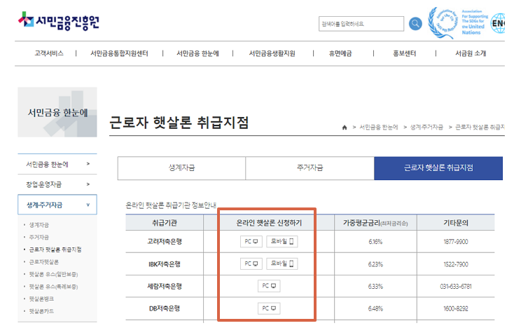 근로자 햇살론 취급지점 항목에서 금리 비교 등을 통해 해당 은행에서 신청하시면 됩니다. 서민금융지원 위 사진 화면에서는 모바일과 PC 신청 모두 가능하기 때문에 편한 방법으로 하실 수 있습니다.