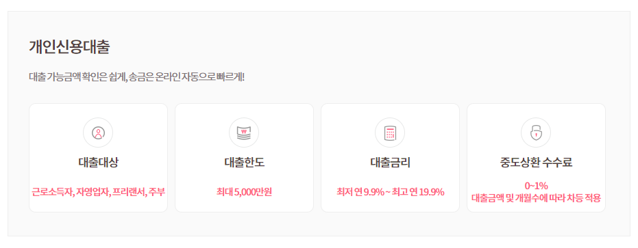 - 대출자격 : 직업, 소득에 관계없이 만 19세 이상 내국인, 연체 부도정보 등 신용도판단저보 등재 사실이 없는 고객