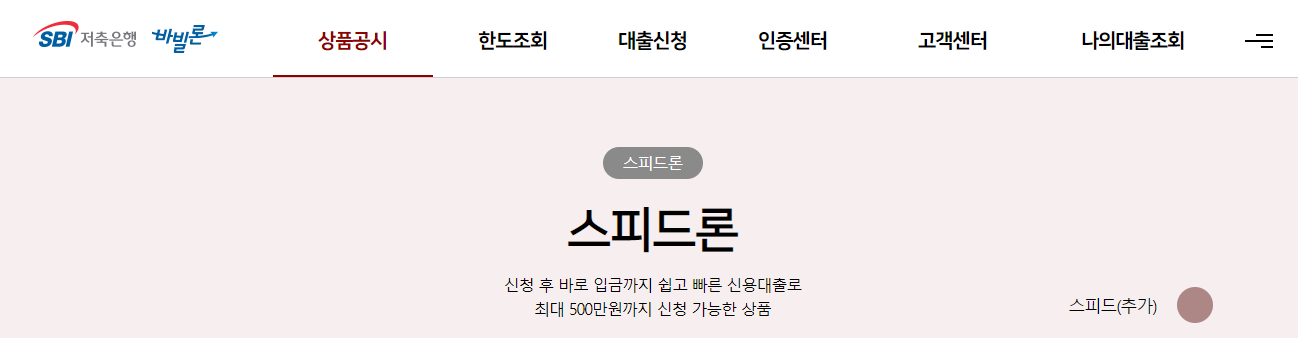 다음은 SBI저축은행에서 운영하는 스피드론 대출 상품입니다. 간편하게 빠른 신용대출 상품이며, 신용점수 350점 이상의 낮은 점수로도 누구나 쉽게 대출이 가능합니다.