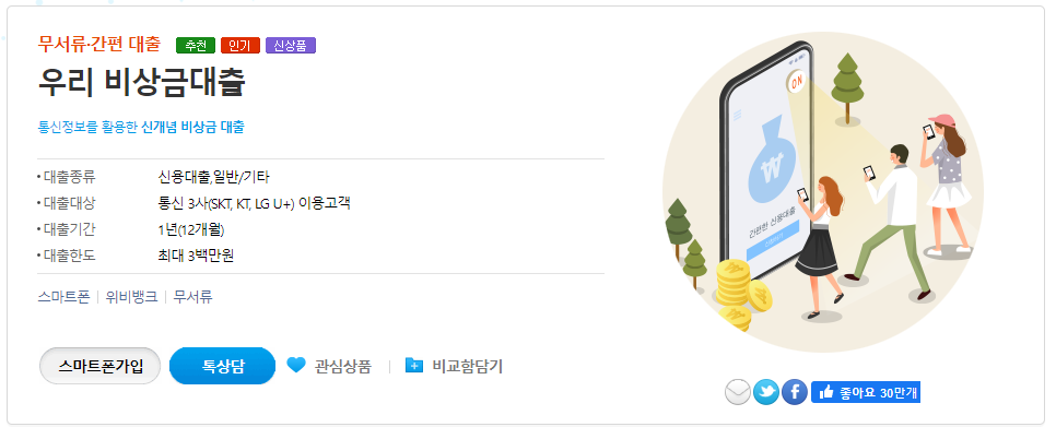 무서류 간편 대출을 해주는 우리은행의 우리 비상금대출입니다. 조건은 통신3사를 이용하고 있는 고객이며, 1금융권 답게 저렴한 금리로 1년간 최대 300만원까지 대출이 가능합니다.