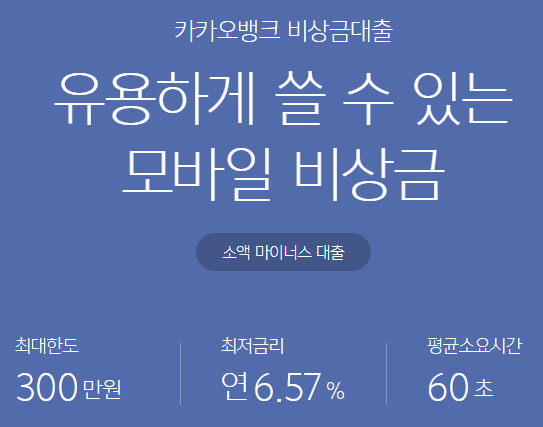 카카오뱅크의 비상금대출은 마이너스통장 형식으로 언제든 간편하게 이용하고 간편하게 상환할 수 있는 형식의 대출 상품입니다. 카카오뱅크는 저렴한 금리로 유명한 인터넷 통장답게 금리가 타 금융사 대비 낮은 편입니다.