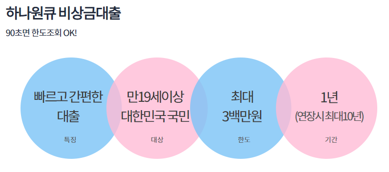 하나은행의 하나원큐 비상금대출은 90초면 한도조회가 가능한 초스피드 주부대출입니다.