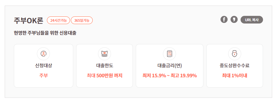 대표적인 주부대출 상품으로 소득증빙이 어려우신 주부님들이 최대 500만원까지 대출 받을 수 있습니다.