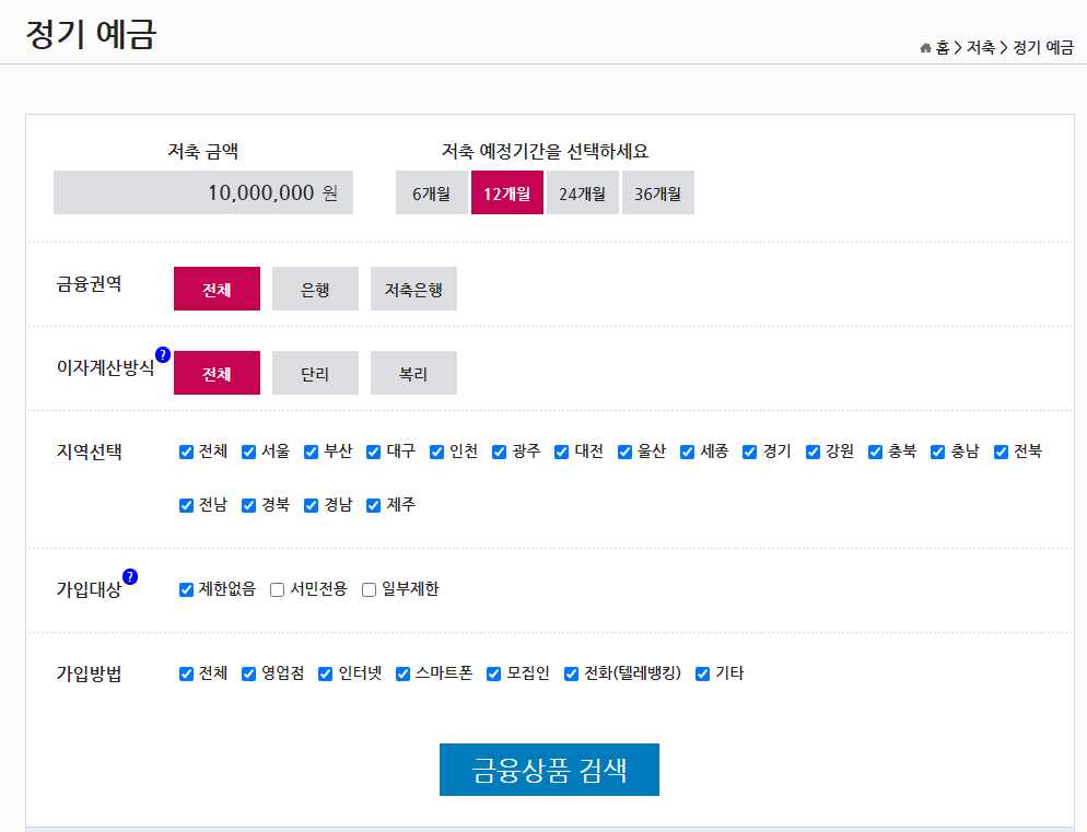 사이트에 들어가시면 왼쪽 상단 저축에서 정기 예금을 클리하시면 본인의 상황에 맞게 설정하는 란이 나옵니다.