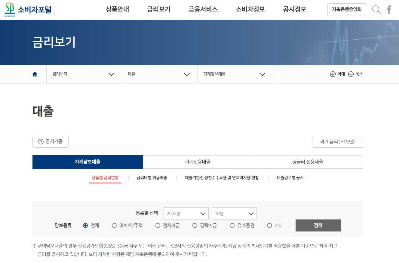 소비자포털사이트에서 대출금리보기를 클릭하시면 바로 대출 금리 확인이 가능합니다. 아주 쉽죠? 가계담보대출, 가계신용대출, 중금리 신용대출 등 다양한 선택지를 통해 세밀한 금리비교가 가능하며, 담보 종류를 통해 한도 조회까지 쉽게 할 수 있습니다.