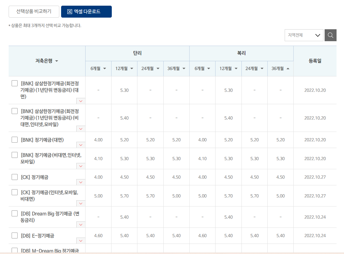 쭈욱 밑으로 내리시면 각 저축은행별 단리와 복리 기준 정기예금 상품이 나옵니다. 이 사이트에 좋은점은 최대 3개의 상품을 선택하여 비교하기를 할 수있는데요. 게다가 엑셀 자료를 바로 받을 수 있어, 추후 자료 활용도 가능합니다.