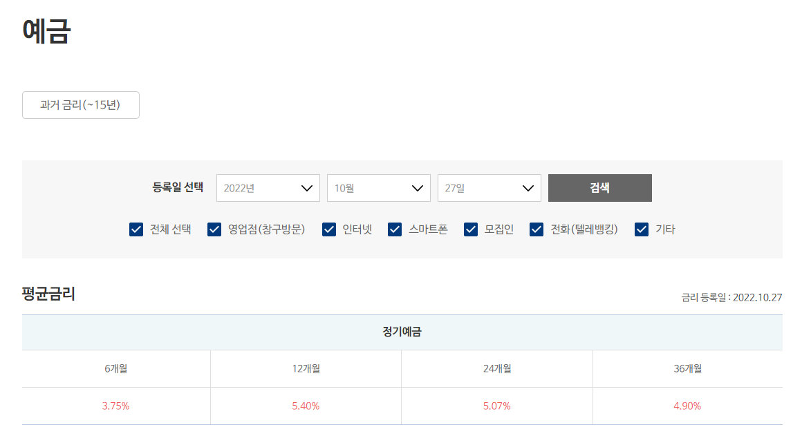 예금금리를 클릭하시면 과거 금리부터 현재 금리까지 모두 검색을 통해 볼 수 있고, 금일 기준 정기예금의 평균 금리를 확인할 수 있습니다.