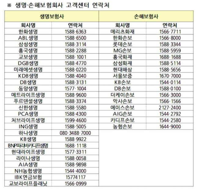다음은 보험사별 고객센터 연라처를 정리해둔 표이기 때문에 아래서 확인하시고 자신의 보험사가 온라인 청구 서비스를 지원하지 않는다면 고객센터 연락을 통해 숨은 보험금을 받으시길 바랍니다.