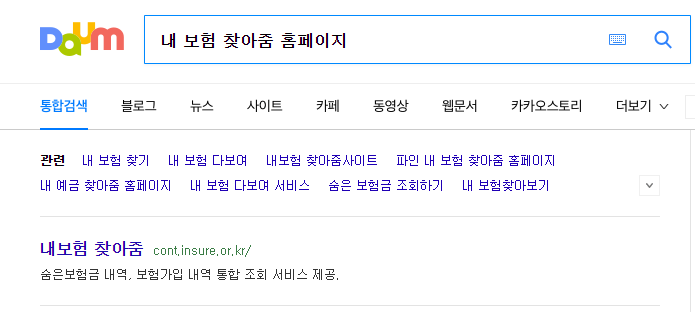 먼저 검색 포털창에 내보험 찾아줌이라고 검색하시면 아래와 같은 화면이 나오는데 바로 사이트가 뜨기 때문에 클릭 한번으로 쉽게 사이트에 접속하실 수 있습니다.