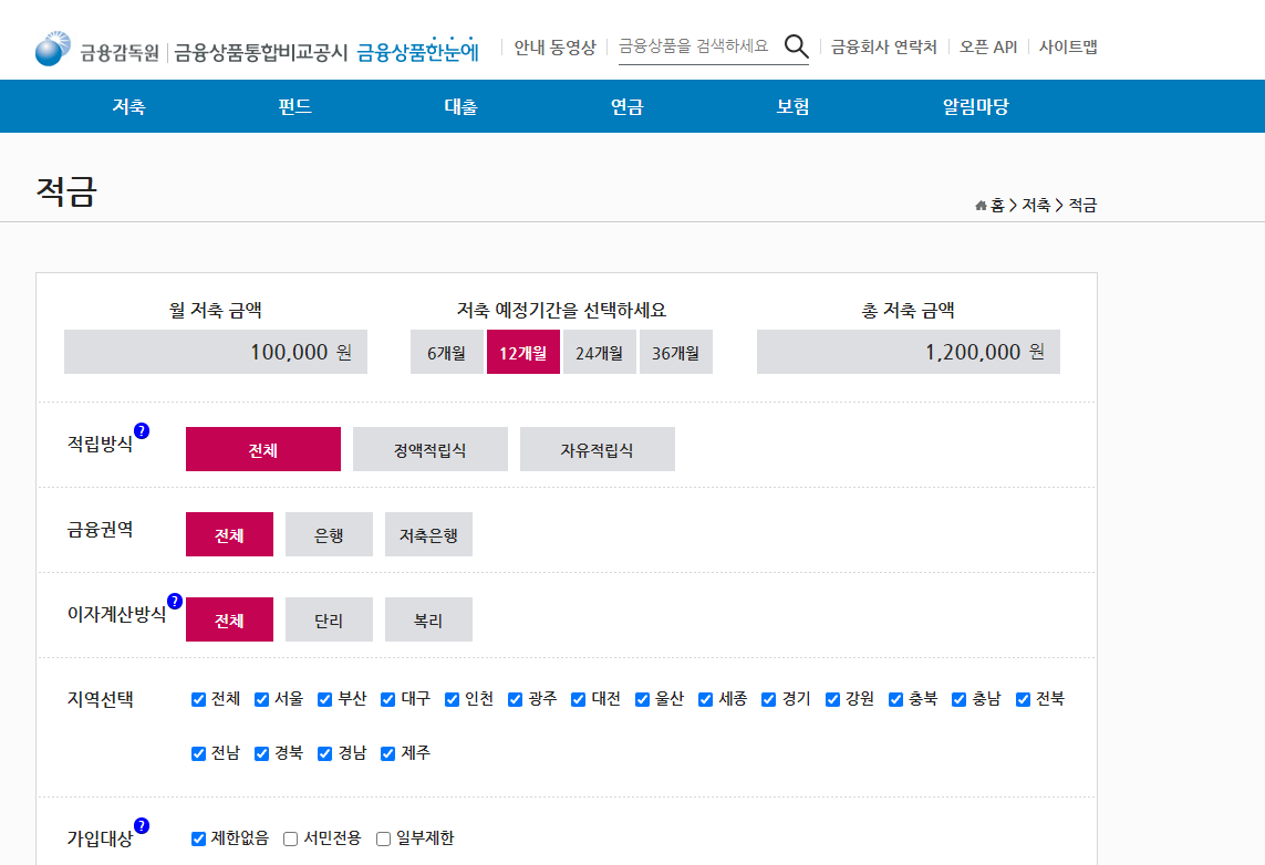 마지막은 금융감독원에서 운영하는 금융상품 한눈에 라는 사이트입니다.