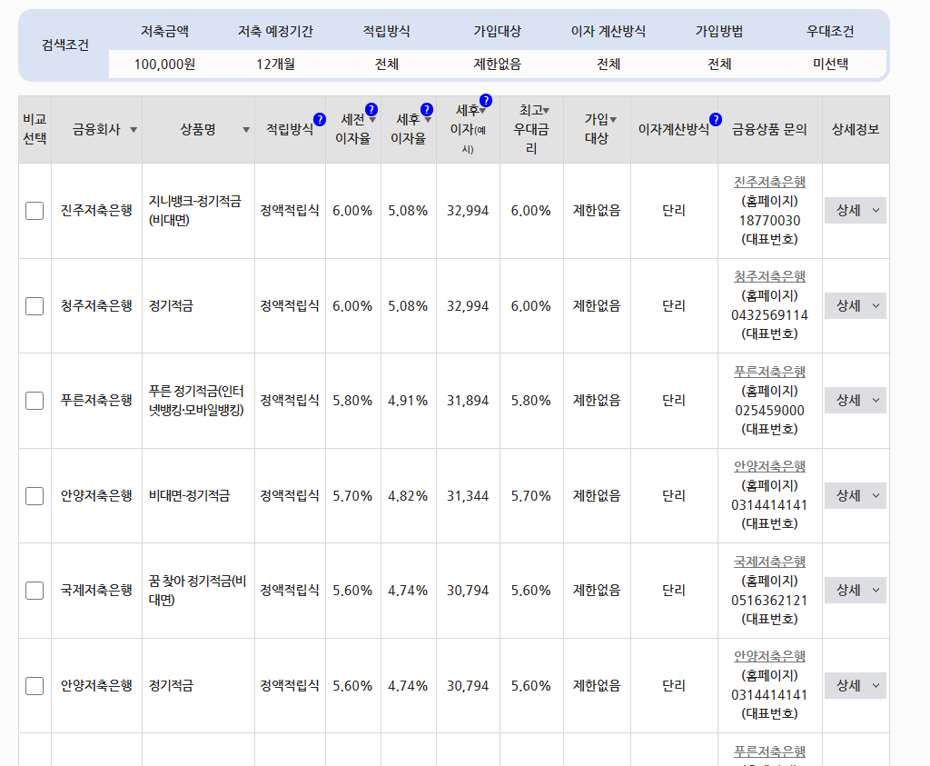 조건을 두고 검색하게 되면 위 사진처럼 다양한 적금 상품이 나오게 되고 해당 상품들의 세전 이자율과 세후 이자율 등 소비자가 정말 알고싶은 정보 위주로 알려주고 있습니다.