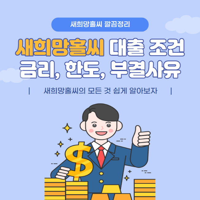 이상으로 오늘은 새희망홀씨 대출의 조건, 금리, 한도와 부결사유에 대해서도 알아보았는데요. 정부지원 대출이 금리가 많이 저렴하기 때문에 해당되시는 분들은 새희망홀씨와 햇살론을 같이 알아보시는 것이 좋습니다. 감사합니다.