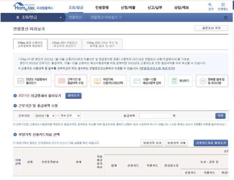 왼쪽 하단에 보이시는 3단계의 버튼이 있습니다. 1단계부터 순서대로 진행해주시면 연말정산 세액공제 금액을 바로 알아볼 수 있습니다.