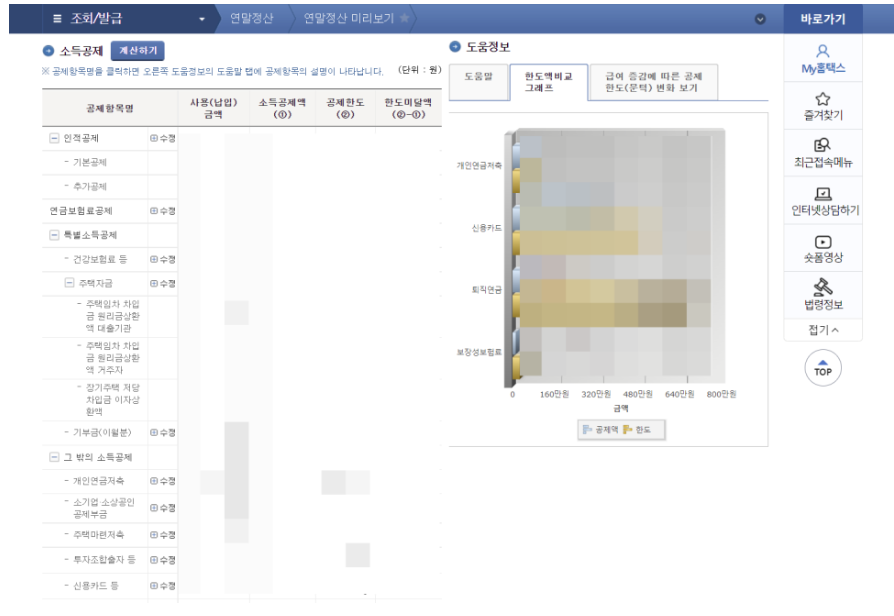 신용카드 사용액 뿐만아니라, 전통시장, 대중교통, 도서, 공연 등 각 항목별로 공제한도와 공제금액, 한도미달액이 얼마인지 확인하실 수 있습니다.