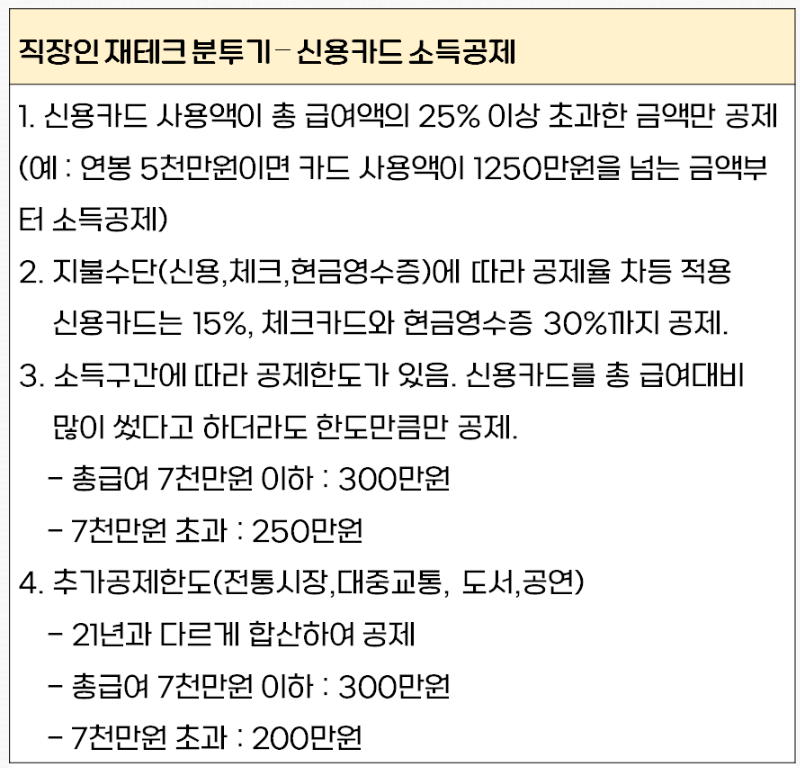 22년에는 총 급여 수준에 1억2,000만원이 없어지고 7,000만원 이상으로 통합되었습니다. 그리고 21년에는 전통시장, 대중교통, 도서, 공연의 한도가 각각 항목별 100만원이었지만, 올해는 통합 300만원으로 한도가 변경되었습니다.
