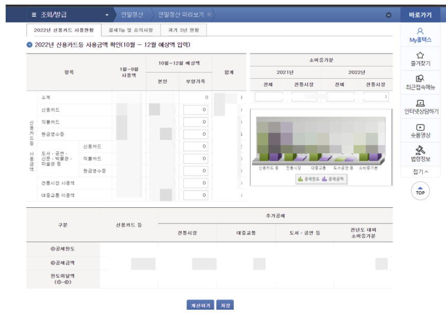 1단계인 신용카드 소득공제액 계산하기 입니다. 9월까지의 신용카드 사용액이 집계되기 때문에 앞으로 3달치 사용액을 더 추가하긴 해야합니다.