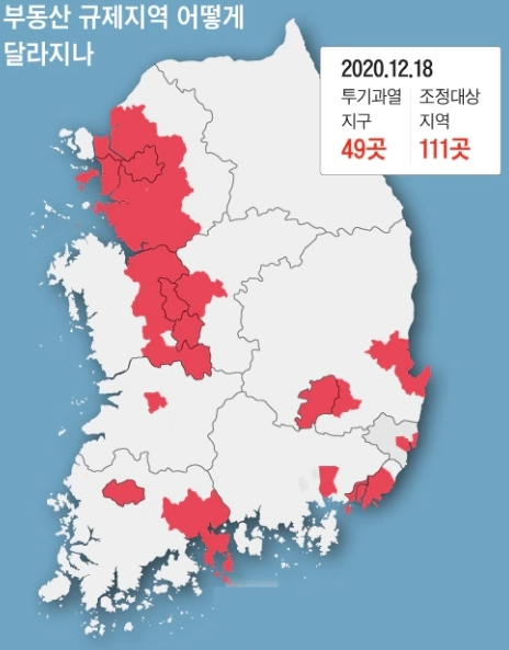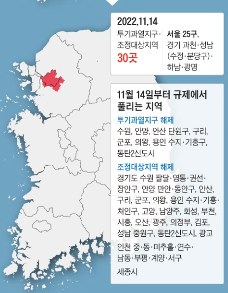 한참 부동산 급등기가 찾아온 2020년도와 비교해 보면, 투기과열지구 49곳 조정대상지역 111곳이었던 것에 대비해 30곳으로 줄어들었습니다.