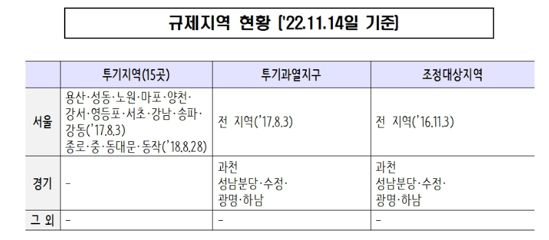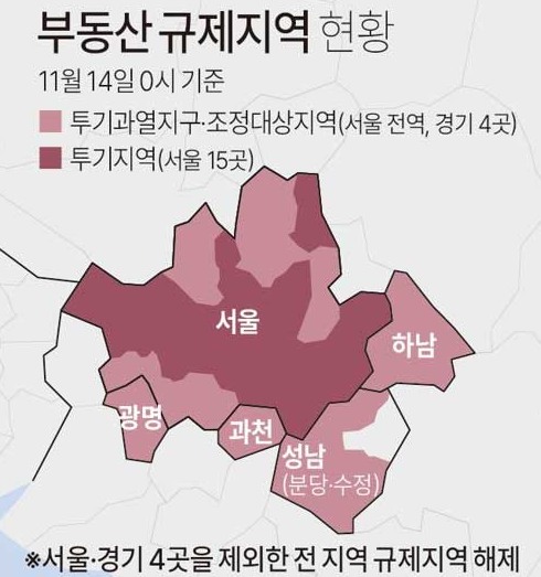 11월 14일 기준으로 이제 남아있는 투기지역은 서울의 용산,성동,노원,마포,양천,강서,영등포,서초,강남,송파,강동,종로,동대문,동작 등 집값이 높은 지역이며 투기과열지구와 조정대상지역은 는 서울의 투기지역 외 나머지 입니다. 경기권에서는 투기지역은 없고 투기과열지구와 조정대상지역은 과천, 성남, 광명, 하남 4곳이 전부이며, 수도권 외 지방 지역은 어떠한 규제 지역도 없습니다.