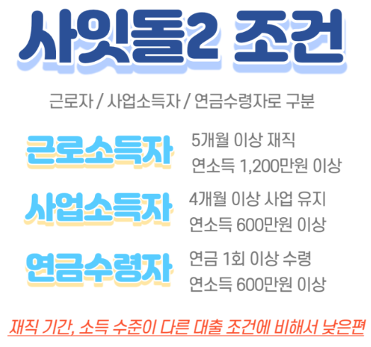 대부분의 정부지원 대출 상품은 연소득 기준이 빡빡한 경우가 있지만 사잇돌2는 별다른 소득이 없는 연금수급자도 쉽게 승인이 가능한 대출입니다.
