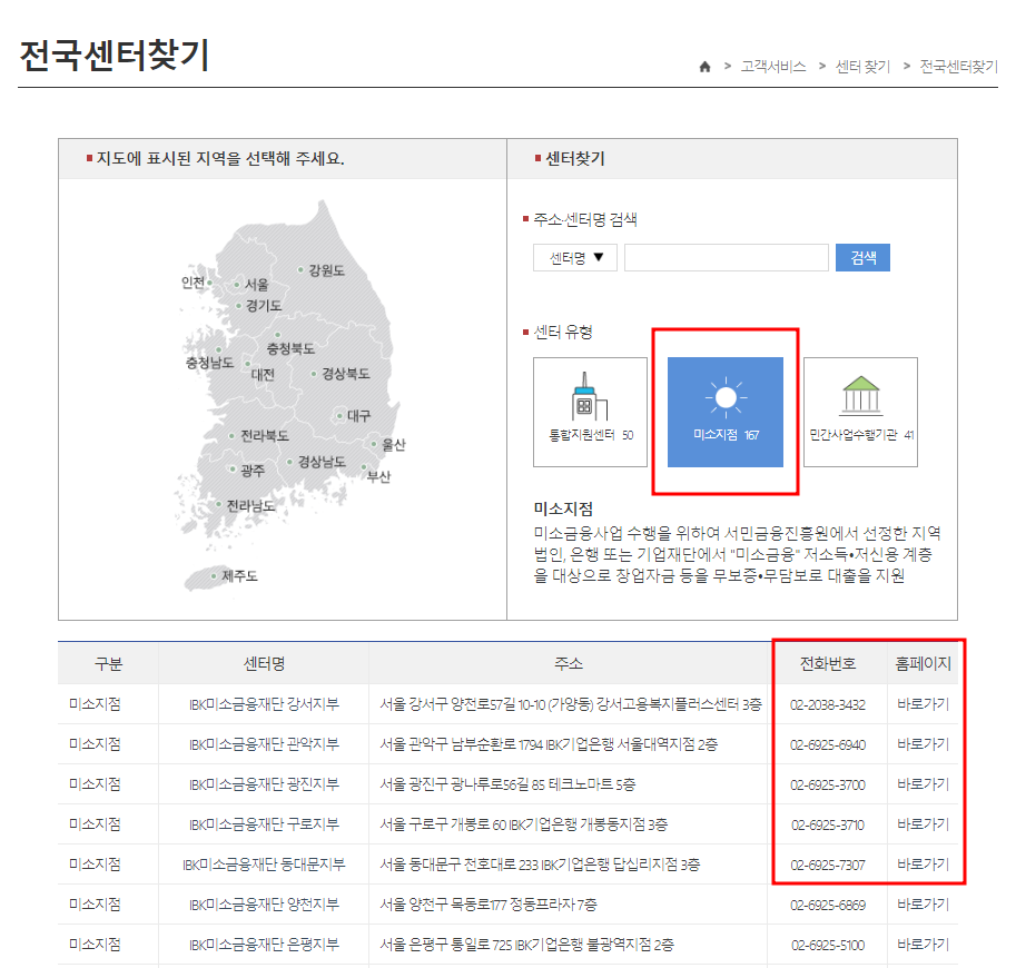 전국센터찾기를 통해 나온 페이지에서 가운데에 있는 미소지점 167을 클릭해주시면 전국 미소금융 신청 센터의 안내가 나옵니다.