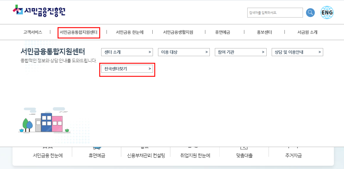 서민금융진흥원에 들어가시면 서민금융통합지원센터 - 전국센터찾기를 클릭해주세요.