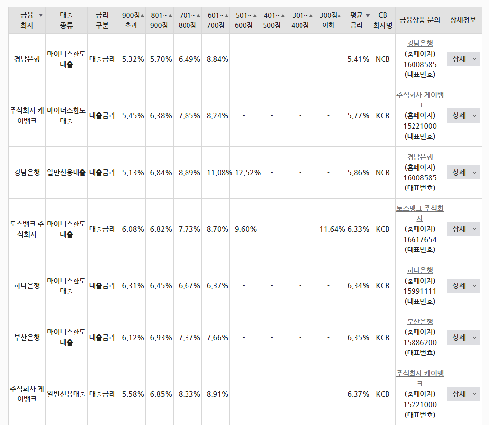 검색결과 위 사진처럼 신용점수 대비 금리정보와 평균 대출금리를 은행 상품별로 간단하게 알아볼 수 있습니다.
