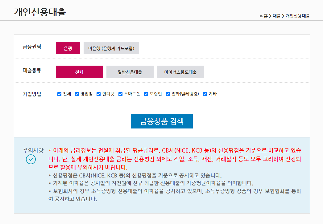 개인 신용대출 상품을 검색하기 위해 금융권역, 대출의 종류, 가입방법 등의 조건들을 선택하시고 금융상품 검색 버튼을 누르시면 됩니다.