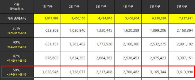 교육급여를 수급받을 수 있는 중위소득 50%의 기준은 1인가구 기준 1,038,946원입니다. 4인가구 기준으로는 2,700,482원으로 해당 소득 기준에 포함되어 있으시다면 기초생활수급자 신청이 가능하게 됩니다.