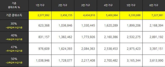 기초생활수급자 자격요건에 해당되는 중위소득 50%는 얼마일까요?