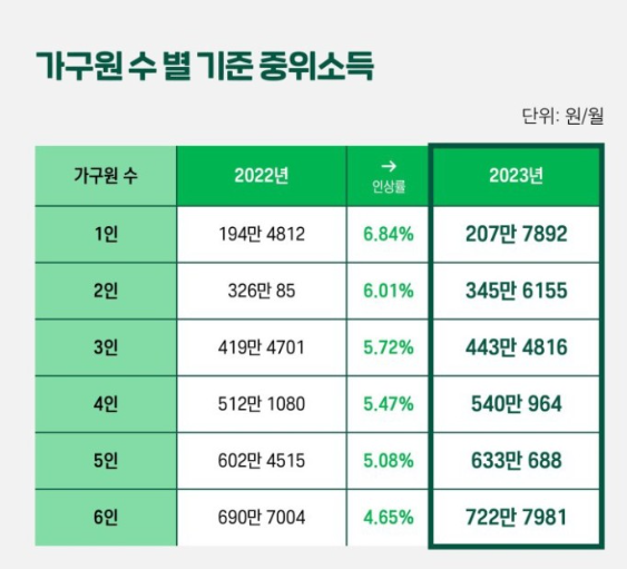 올해인 2022년에는 1인가구 기준 중위소득이 194만원이었는데, 2023년에는 6.84% 인상된 207만원이 기준이됩니다. 가장 많은 가구형태인 4인가구의 경우 512만원에서 540만원으로 중위소득이 인상되게 되는데요.