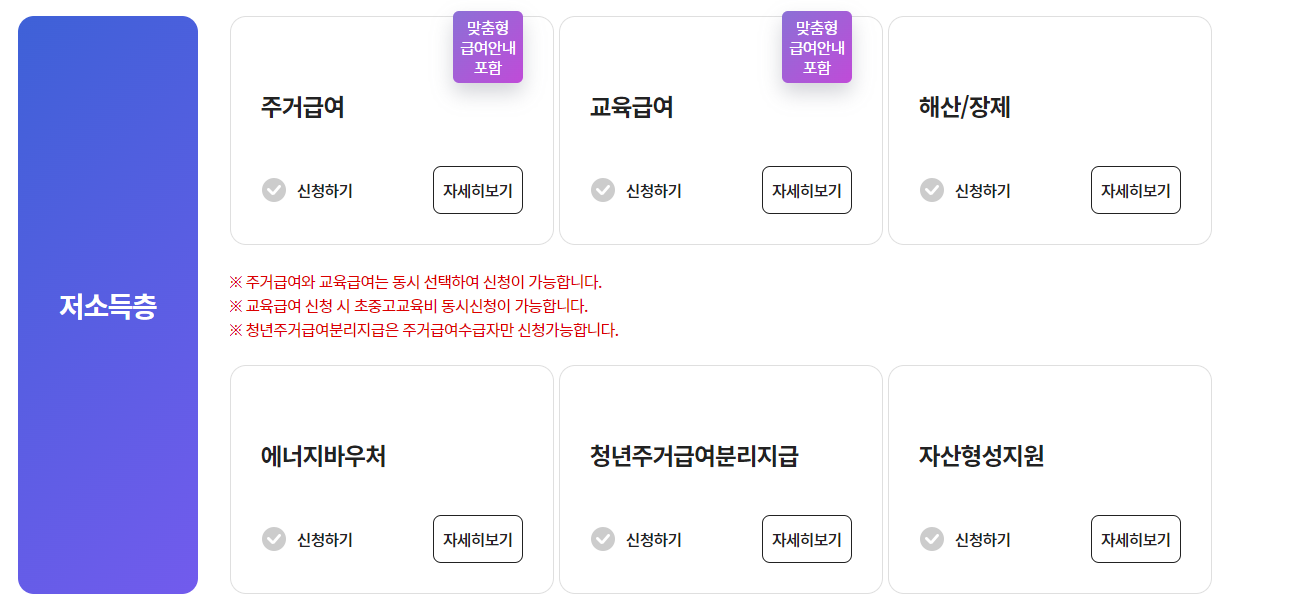 로그인을 하시면 신청할 수 있는 복지 급여가 엄청 많이나옵니다. 쭈욱 밑으로 내리다보면 위 사진처럼 저소득층을 위한 주거급여, 교육급여 등을 신청할 수 있는 화면이 있습니다. 해당하는 급여에 신청하기 버튼을 클릭하시면 끝! 쉽죠?