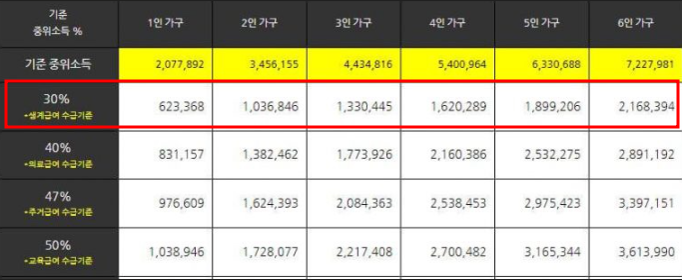 | 생계급여 | 소득인정액이 기준 중위소득 30% 이하 |