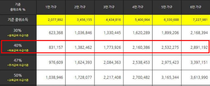 | 의료급여 | 소득인정액이 기준 중위소득 40% 이하 |