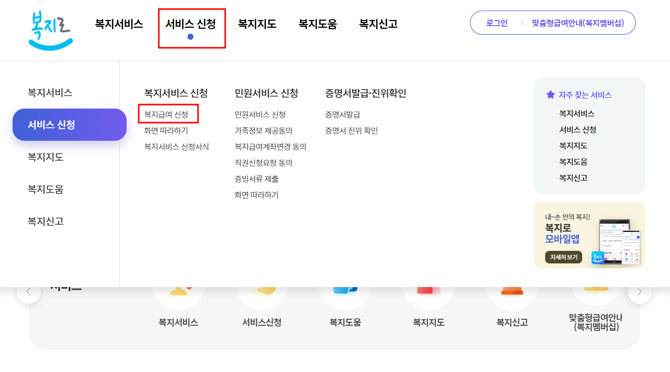 복지로 홈페이지에 들어가시면, 위와 같은 화면이 나옵니다. 왼쪽 상단에 보이는 서비스 신청 >> 복지급여 신청 순으로 클릭해주세요.